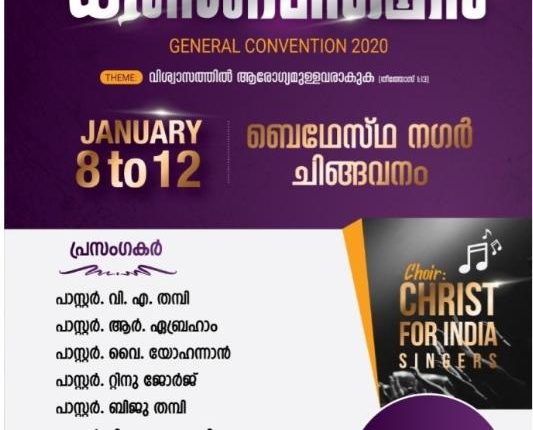 ചിങ്ങവനം: ന്യൂ ഇന്ത്യ ചർച്ച് ഓഫ് ഗോഡ് ജനറൽ കൺവൻഷൻ ഒരുക്കങ്ങൾ പുരോഗമിക്കുന്നു. പ്രാരംഭ ദിവസമായ നാളെ(8 /01/2020)ന്യൂ ഇന്ത്യ ചർച്ച് ഓഫ് ഗോഡ് പ്രസിഡന്റ് പാസ്റ്റർ വി.എ തമ്പി ഉദ്ഘാടനം ചെയ്യുകയും, പാസ്റ്റർ സി.എക്സ് ബിജു ദൈവവചനം ശുശ്രൂഷിക്കുകയും ചെയ്യുന്നു.