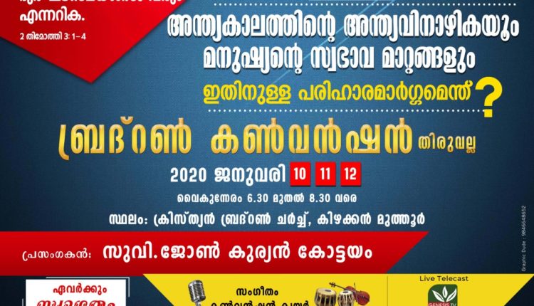 തിരുവല്ല: തിരുവല്ല ചുറ്റുപാടുമുള്ള ബ്രദറൺ സഭകളുടെ കൺവെൻഷൻ ഇന്നുമുതൽ ആരംഭിക്കും. 11, 12 തീയതികളിൽ കിഴക്കൻമുത്തൂർ ക്രിസ്ത്യൻ ബ്രദറൺ ചർച്ച് അങ്കണത്തിൽ നടക്കുന്നു. പ്രശസ്ത വേദ പണ്ഡിതൻ ഇവാ. ജോൺ കുര്യൻ (കോട്ടയം) “അന്ത്യ കാലത്ത് മനുഷ്യ സ്വഭാവത്തിൽ വരുന്ന മാറ്റങ്ങൾ” തിരുവചന അടിസ്ഥാനത്തിൽ സംസാരിക്കുന്നു. വൈകുന്നേരം 6.30-8.30 വരെ മൂന്ന് ദിവസവും സന്ദേശവും ഗാനശുശ്രുഷയും ഉണ്ടായിരിരിക്കും.