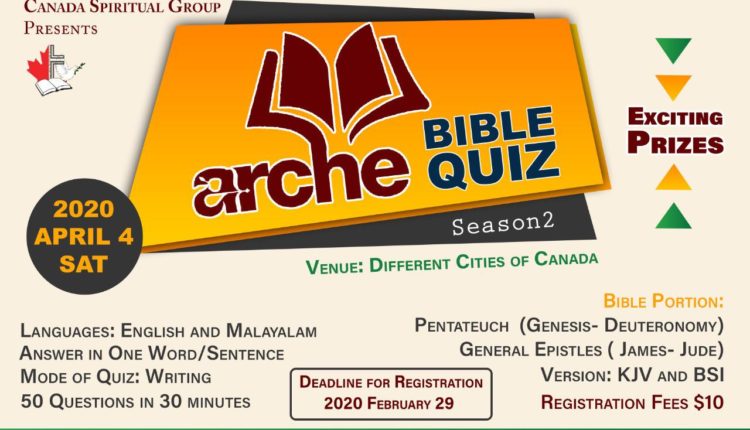 കാനഡ സ്പിരിച്ചൽ ഗ്രൂപ്പിന്റെ(CSG) ആഭിമുഖ്യത്തിൽ 2020 ഏപ്രിൽ 4 (ശനിയാഴ്ച) ബൈബിൾ ക്വിസ് മത്സരം കാനഡയിലെ 26 പട്ടണങ്ങളിലായി നടത്തപ്പെടുന്നു.