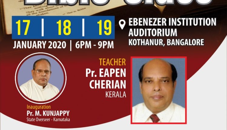 ബാംഗ്ലൂർ: ചർച്ച് ഓഫ് ഗോഡ് ഇൻ ഇന്ത്യ കർണാടക സ്റ്റേറ്റ് വൈ.പി.ഇയുടെ ആഭിമുഖ്യത്തിൽ മൂന്നുദിന ബൈബിൾ ക്ലാസ് ഇന്നുമുതൽ കൊത്തന്നൂർ എബനേസർ ഇൻസ്റ്റിറ്റ്യൂട്ടിൽ ഇന്ന് തുടങ്ങും. ദിവസവും വൈകുന്നേരം 6മുതൽ 9 വരെയാണ്. ഇന്ന് വൈകിട്ട് ചർച്ച് ഓഫ് ഗോഡ് കർണാടക സ്റ്റേറ്റ് കൗൺസിൽ സെക്രട്ടറി പാസ്റ്റർ ഇ ജെ ജോൺസൺ ഉദ്ഘാടനം ചെയ്യും.
