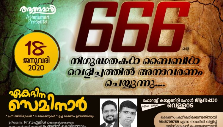തിരുവനന്തപുരം: ആത്മമാരി സംഘടിപ്പിക്കുന്ന “666 ന്റെ നിഗൂഢതകളെ ബൈബിൾ വെളിച്ചത്തിൽ അനാവരണം ചെയ്യുന്ന സെമിനാർ” 2020 ജനുവരി 18 ശനിയാഴ്ച ആനപ്പാറ (വെള്ളറട) ഫോറസ്റ്റ് കമ്യൂണിറ്റി ഹാളിൽ വെച്ച് നടത്തപ്പെടുന്നു. ആത്മമാരി ഡയറക്ടർ പാസ്റ്റർ.വൈ.എസ്.എലീശാ ഉത്ഘാടനം ചെയ്യുന്ന ഈ സെമിനാറിൽ ക്രിസ്തുവിൽ പ്രസിദ്ധനായ പാസ്റ്റർ.അനിൽ കൊടിത്തോട്ടം ക്ലാസ്സുകൾ നയിക്കുന്നു. രാവിലെ 9.30 മുതൽ 1.30 വരെ ഒന്നാം സെക്ഷനും ഉച്ച കഴിഞ്ഞ് 2.30 മുതൽ 4.30 വരെ രണ്ടാം സെക്ഷനും രാത്രി 6.30 മുതൽ 9.00 വരെ അവസാന സെക്ഷനും ക്രമീകരിച്ചിരിക്കുന്നു. ബ്രദർ.ജിബിൻ ജോസ് ആത്മീയ ആരാധനയ്ക്ക് നേതൃത്വം നൽകുന്നു. ആത്മമാരി വർഷിപ്പ് ടീം ഗാനങ്ങൾ ആലപിക്കുന്നു. ഈ സെമിനാറിൽ വിവിധ ക്രൈസ്തവ വിഭാഗങ്ങളിലെ ശ്രേഷ്ഠരായ വ്യക്തികൾ പങ്കെടുക്കുന്നു. 666 ന്റെ സത്യങ്ങളെ കുറിച്ച് ആഴമായി മനസിലാക്കുവാൻ ജാതി-മത ഭേദമന്യേ എല്ലാവരേം യേശുക്രിസ്തുവിന്റെ നാമത്തിൽ ക്ഷണിക്കുന്നു.
