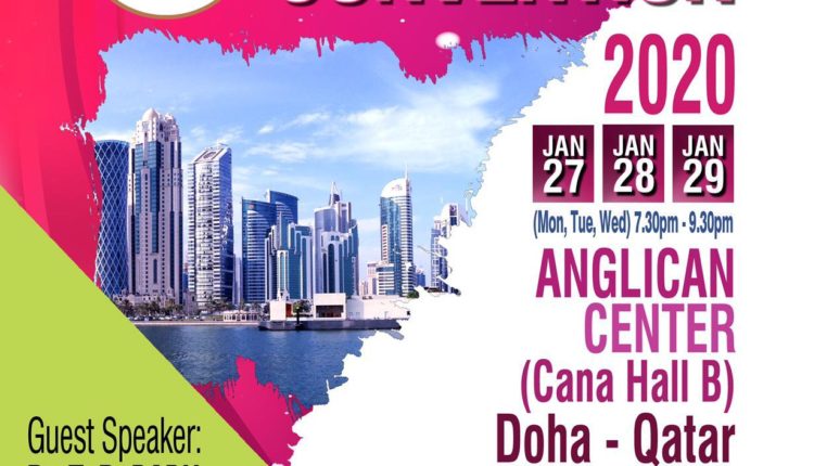 പ്രസ്തുത മീറ്റിംഗ് 2020 ജനുവരി 27 മുതൽ 29 വരെ വൈകീട്ട് 7:00 മുതൽ 9:30 വരെ ആംഗ്ലിക്കൻ സെന്ററിൽ കാനാ ഹാൾ ബി – യിൽ വച്ച് നടത്തപ്പെടുന്നു. ഗാനങ്ങൾക്കു ചർച്ച് ഓഫ് ലിവിങ് വാട്ടർ ക്വയർ നേതൃത്വം നൽകുന്നതായിരിക്കും. ഈ മൂന്ന് ദിനങ്ങളിൽ നടത്തപ്പെടുന്ന കൺവെൻഷനിലേക്ക് ഖത്തറിൽ ഉള്ളതായ എല്ലാ പ്രീയപ്പെട്ടവരെയും ക്ഷണിക്കുന്നതായി ഭാരവാഹികൾ ക്രൈസ്തവ എഴുത്തുപുര ഖത്തർ ചാപ്റ്ററിനോട് അറിയിച്ചു.