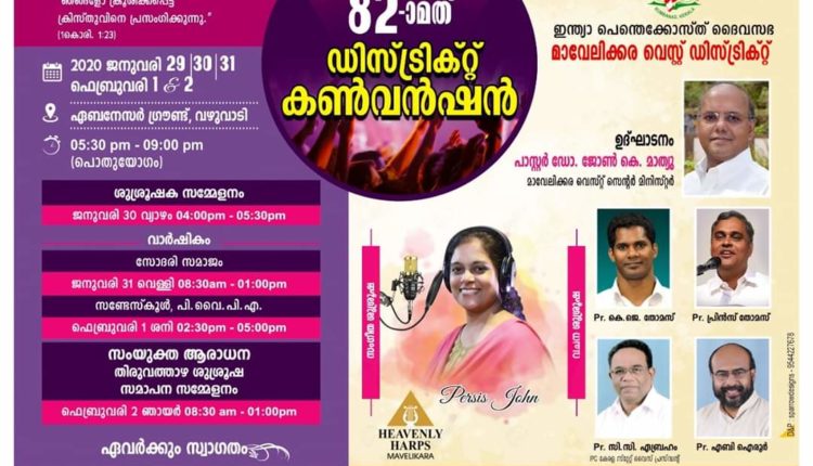 മാവേലിക്കര: ഐ.പി.സി മാവേലിക്കര വെസ്റ്റ് സെന്റർ കൺവൻഷൻ ജനുവരി 29 മുതൽ ഫെബ്രുവരി 2 വരെ വഴുവാടി എബനേസർ ഗ്രൗണ്ടിൽ നടത്തപ്പെടുന്നു. സെന്റർ മിനിസ്റ്റർ ഡോ. ജോൺ കെ മാത്യു ഉദ്ഘാടനം ചെയ്യും. പാസ്റ്റർമാരായ കെ.ജെ തോമസ്, പ്രിൻസ് തോമസ്, സി.സി എബ്രഹാം, എബി അയിരൂർ എന്നിവർ ദൈവവചനം സംസാരിക്കും. മാവേലിക്കര ഹെവൻലി ഹാർപ്സിനൊപ്പം പെർസിസ് ജോൺ ഗാന ശുശ്രുഷ നിർവഹിക്കുന്നു.