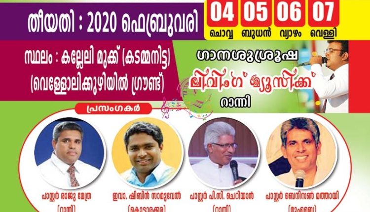 പത്തനംതിട്ട: ഐ.പി.സി എബനേസർ കടമ്മനിട്ട, കല്ലേലി സഭയുടെ ആഭിമുഖ്യത്തിൽ ഫെബ്രുവരി 4,5,6,7 തീയതികളിൽ കടമ്മനിട്ട, കല്ലേലി മുക്കിൽ (വെള്ളോലി കുഴിയിൽ ഗ്രൗണ്ടിൽ) വെച്ച് കൺവൻഷൻ നടക്കും.
