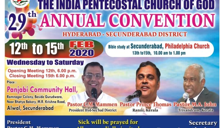 സെക്കന്തരാബാദ്: ഇന്ത്യാ പെന്തക്കോസ്ത് ദൈവസഭ ഹൈദരാബാദ് -സെക്കന്ദരാബാദ് ഡിസ്ട്രിക്ട് കൺവെൻഷൻ ഫെബ്രുവരി 12 മുതൽ 15 ശനിയാഴ്ച വരെ ഹൈദരാബാദ് അൽ വാൽ പഞ്ചാബി കമ്മ്യൂണിറ്റി ഹാളിൽ വൈകിട്ട് 6 മണിമുതൽ നടക്കും.