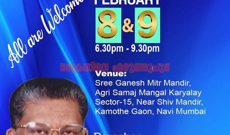 നവി മുംബൈ: കാമോത്തേ ഏ.ജി ചർച്ചിന്റെ സുവിശേഷ യോഗം ഇന്നും,നാളെയും(ഫെബ്രുവരി 8, 9) വൈകിട്ട് 6 :30 മുതൽ 9 മണി വരെ കാമോത്തേയിൽ ഉള്ള അഗ്രി സമാജ് മംഗൾ കാര്യാലയത്തിൽ വച്ചു നടക്കപെടും. റവ.ഡോ.ഒ.എം രാജുകുട്ടി ഈ ദിവസങ്ങളിൽ ദൈവവചനത്തിൽ നിന്ന് സംസാരിക്കും.റവ.ബി മാത്യു നേത്രത്വം നൽകും.