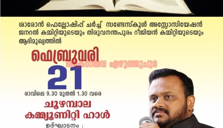 തിരുവനന്തപുരം: ശാരോൻ ഫെല്ലോഷിപ്പ് ചർച്ച് സൺഡേസ്കൂൾ അസോസിയേഷൻ ജനറൽ കമ്മറ്റിയുടെയും തിരുവനന്തപുരം റീജിയൺ കമ്മറ്റിയുടെയും ആഭിമുഖ്യത്തിൽ ഏകദിന സെമിനാർ ഫെബ്രുവരി 21 ന് നടത്തപ്പെടുന്നു. രാവിലെ 9:30 മുതൽ 1:30 വരെ ചൂഴമ്പാല കമ്മ്യുണിറ്റി ഹാളിൽ വച്ചാണ് സെമിനാർ നടക്കുന്നത്.