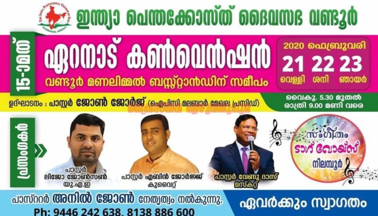 വണ്ടൂർ: വണ്ടൂർ ഇന്ത്യാ പെന്തക്കോസ്ത് ദൈവസഭയുടെ ആഭിമുഖ്യത്തിൽ 15-മത് ഏറനാട് കൺവെൻഷൻ ഫെബ്രുവരി 21 മുതൽ 23 വരെ നടത്തപ്പെടുന്നു. എല്ലാ ദിവസവും 5:30 മുതൽ 9 മണിവരെ മണലിമ്മൽ ബസ് സ്റ്റാൻഡിന് സമീപമാണ് യോഗങ്ങൾ നടക്കുന്നത്.