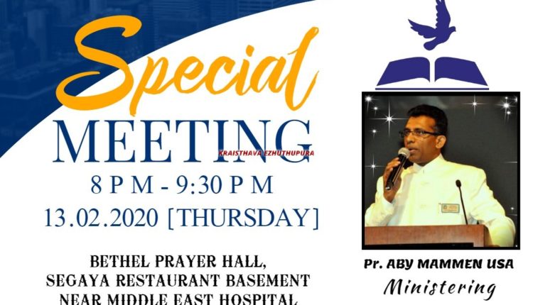 ബഹറിൻ: ബഹറിൻ ബെഥേൽ പെന്തക്കോസ്തൽ ചർച്ചിന്റെ ആഭിമുഖ്യത്തിൽ സ്പെഷ്യൽ മീറ്റിംഗ് ഫെബ്രുവരി 13 ന് നടത്തപ്പെടുന്നു. മിഡിൽ ഈസ്റ്റ് ഹോസ്പിറ്റലിന് സമീപം സെഗയാ റെസ്റ്റോറന്റ് ബേസ്മെന്റ് ബെഥേൽ പ്രയർ ഹാളിൽ വച്ച് രാത്രി 8 മണിമുതൽ 9:30 വരെയാണ് യോഗം നടക്കുന്നത്. പാസ്റ്റർ എബി മാമ്മൻ(യു.എസ്.എ)മുഖ്യ സന്ദേശം നൽകും.