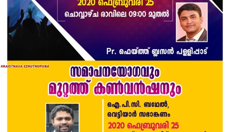 ഫെബ്രുവരി 25 ചൊവ്വാഴ്ച രാവിലെ 9 മണി മുതൽ വൈകിട്ട് 6 മണി വരെ സുവിശേഷ യാത്ര മാവേലിക്കര സെന്ററിന്റെ വിവിധ ഭാഗങ്ങളിൽ നടത്തപ്പെടുന്നു. പാസ്റ്റർ ഫെയ്ത്ത് ബ്ലസൻ പള്ളിപ്പാട് മുഖ്യ സന്ദേശം നൽകും.