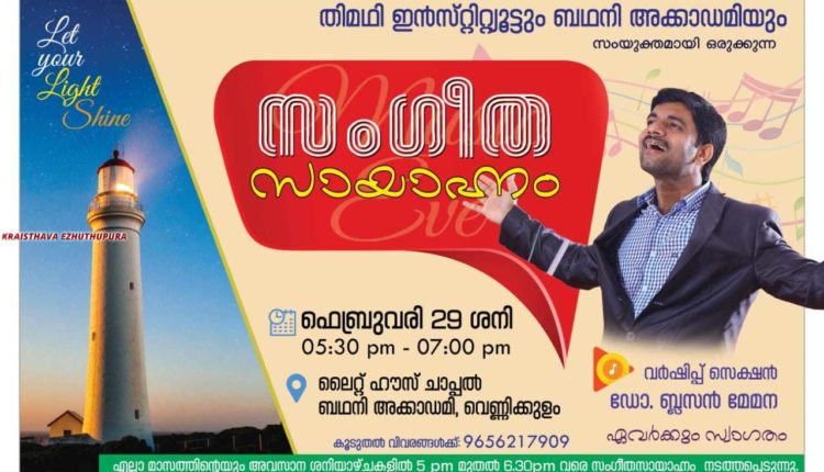 വെണ്ണിക്കുളം: തിമഥി ഇൻസ്റ്റിറ്റ്യൂട്ടും വെണ്ണിക്കുളം ബഥനി അക്കാദമിയും സംയുക്തമായി നടത്തുന്ന ക്രിസ്തീയ സംഗീത സായാഹ്നം ഫെബ്രുവരി 29 ശനിയാഴ്ച വൈകുന്നേരം 5.30 മണി മുതൽ 7.00മണി വരെ ബഥനി അക്കാഡമിയിലെ ലൈറ്റ് ഹൗസ് ചാപ്പലിൽ നടക്കും. പ്രശസ്ത ക്രിസ്തീയ സംഗീതജ്ഞൻ ഡോ. ബ്ലസൻ മേമന സംഗീതാരാധനക്ക് നേതൃത്വം നൽകും, കൂടാതെ ജെസ്സിക്ക ജോൺസൻ (ഹൈദരാബാദ്) ഗാനങ്ങൾ ആലപിക്കും.