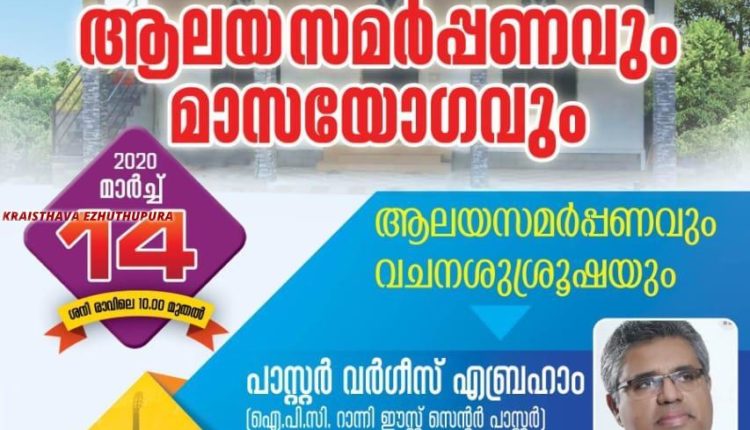 റാന്നി: ഐ.പി. സി എബനേസർ കനകപ്പലം ആലയസമർപ്പണവും മാസയോഗവും മാർച്ച് 14 രാവിലെ 10 മണിമുതൽ നടത്തപ്പെടുന്നു. ഐ.പി. സി റാന്നി ഈസ്റ്റ് സെന്റർ സെക്രട്ടറി എബി പി. ശാമുവേലിന്റെ അധ്യക്ഷതയിൽ ഐ.പി. സി റാന്നി ഈസ്റ്റ് സെന്റർ മിനിസ്റ്റർ പാസ്റ്റർ വർഗീസ് എബ്രഹാം ആലയസമർപ്പണവും വചനശുശ്രൂഷയും നിർവഹിക്കും. സെന്റർ ക്വയർ സംഗീത ശുശ്രൂഷയ്ക്ക് നേതൃത്വം നൽകും.
