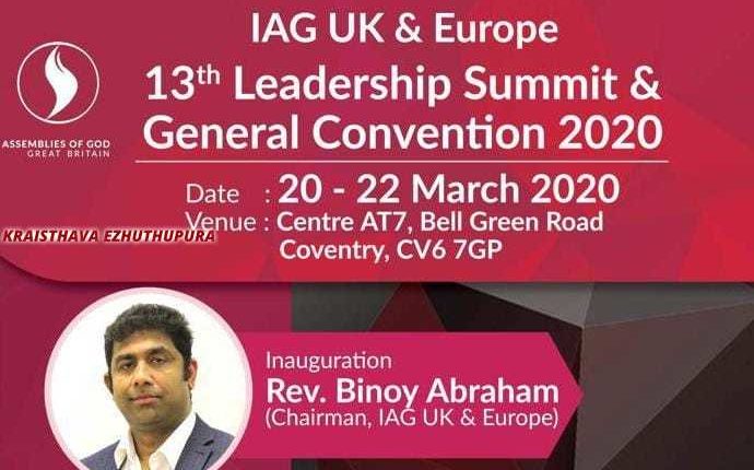 യു.കെ:കവൻഡ്രിയിൽ വെച്ച് നടക്കേണ്ടുന്ന 13- മത് ഐഎജി യൂ കെ & യൂറോപ്പ് കോൺഫറൻസ് കോവിഡ് – 19 നെ തുടർന്ന് മാറ്റി വെച്ചതായി ഐഎജി യൂ കെ & യൂറോപ്പ് ചെയർമാൻ പാസ്റ്റർ.ബിനോയി എബ്രഹാം അറിയിച്ചു.