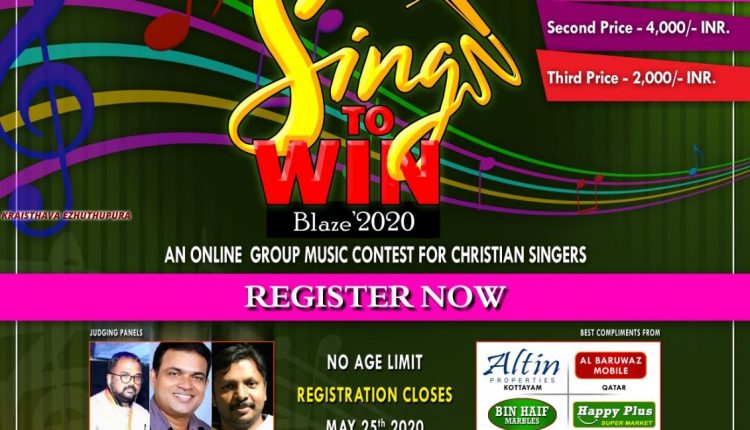 ഖത്തർ: ലോക്ഡൌൺ കാലത്ത് വീട്ടിലിരിന്ന് പാട്ടു പാടി സമ്മാനം നേടാൻ ഇതാ ഒരവസരം. ദോഹ ഗില്ഗാൽ ചർച്ച് ഓഫ് ഗോഡും പെന്തകോസ്തൽ യൂത്ത് കൗൺസിലും(PYC) സംയുക്തമായി ഒരുക്കുന്നു ബ്ലയ്സ് (Blaze) 2020 ഗ്രൂപ്പ് സോംഗ് മത്സരം. വിജയിക്കുന്നവർക്ക് സമ്മാനമായി ക്യാഷ് അവാർഡ് നല്കുന്നതായിരിക്കും.