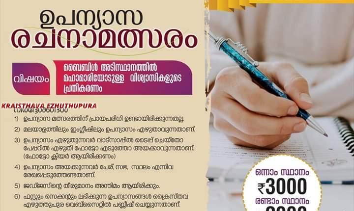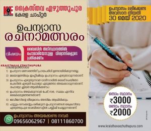 തിരുവല്ല : ക്രൈസ്തവ എഴുത്തുപുര കേരളാ ചാപ്റ്ററിന്റെ ആഭിമുഖ്യത്തിൽ നടത്തപെടുന്ന ഉപന്യാസ രചനാ മത്സരത്തിന്റെ അവസാന തിയതി മെയ് 30 ന് അവസാനിക്കും. “ബൈബിൾ അടിസ്ഥാനത്തിൽ മഹാമാരിയോടുള്ള വിശ്വാസികളുടെ പ്രതികരണം” എന്ന വിഷയത്തെ ആസ്പദമാക്കിയാണ് ഉപന്യസ മത്സരം നടക്കുന്നത്. പ്രായപരിധി ഉണ്ടായിരിക്കുന്നതല്ല, ഇംഗ്ളീഷിലും മലയാളത്തിലും എഴുതാമെന്നും,അതുകൂടാതെ ഫസ്റ്റും,സെക്കന്റും ലഭിക്കുന്ന ഉപന്യാസങ്ങൾ ക്രൈസ്തവ എഴുത്തുപുര വെബ്സൈറ്റിൽ പ്രസിദ്ധീകരിക്കുമെന്നും ഭാരവാഹികൾ അറിയിച്ചു. ഒന്നാം സ്ഥാനം 3000 രൂപയും, രണ്ടാം സ്ഥാനം 2000 രൂപയുമാണ്.