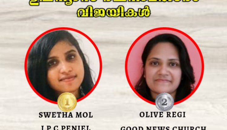 തിരുവല്ല : ക്രൈസ്തവ എഴുത്തുപുര കേരള ചാപ്റ്ററിന്റെ നേതൃത്വത്തിൽ ലോക്ക് ഡൌൺ കാലത്ത് ‘ബൈബിൾ അടിസ്ഥാനത്തിൽ മഹാമാരിയോടുള്ള വിശ്വാസികളുടെ പ്രതികരണം’ എന്ന വിഷയത്തെ അടിസ്ഥാനമാക്കി നടത്തിയ ഉപന്യാസ രചനാ മത്സരത്തിൽ വിവിധ രാജ്യങ്ങളിൽ നിന്നായി നൂറിലധികം പേർ പങ്കെടുത്തു. അതിൽ നിന്നും ഒന്നാം സ്ഥാനം നേടിയത് ചെങ്ങന്നൂർ കൊലടത്തുശ്ശേരി ഐ.പി.സി പെനിയേൽ സഭാംഗമായ ശ്വേതമോൾ. രണ്ടാം സ്ഥാനം നേടിയത് ഹരിദ്വാര് ഗുഡ്ന്യൂസ് സഭാംഗമായ ഒലിവ് റെജി എന്നിവരാണ്.