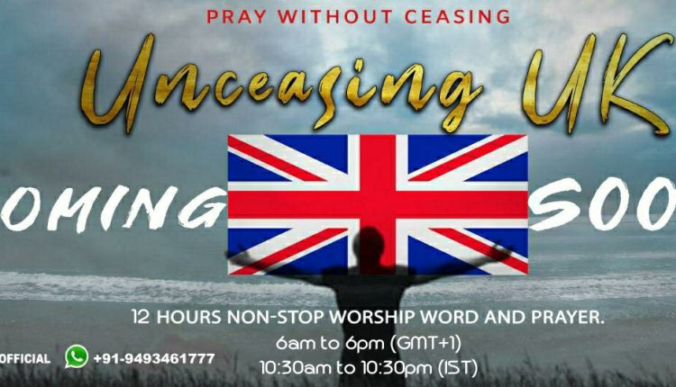 UK കേന്ദ്രീകരിച്ച് തുടർച്ചയായ12 മണിക്കൂർ പ്രാർത്ഥന നടത്തുന്നു. യുകെയിലെ 12 സഭകൾ ചേർന്ന് നടത്തുന്ന ഈ പ്രാർത്ഥന ചങ്ങലയിൽ കൊറോണ പ്രതിസന്ധി നേരിടുന്ന രാജ്യങ്ങൾക്ക് വേണ്ടിയും, നോർത്ത് ഇന്ത്യയ്ക്കായും പ്രാർത്ഥിക്കുന്നു. യുകെ സമയം രാവിലെ 6 മുതൽ വൈകിട്ട് 6 വരെ നടക്കുന്ന ഈ മീറ്റിങ്ങിന് വിവിധ സഭകൾ നേതൃത്വം നൽകും.