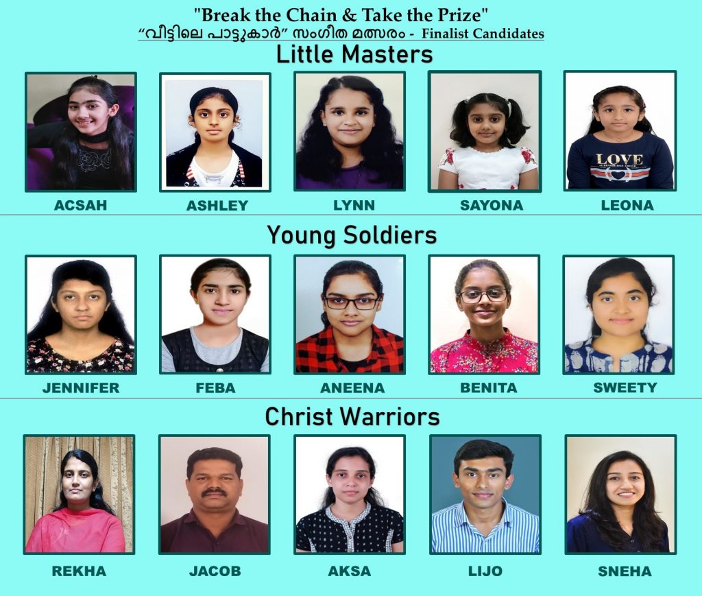 ഒമാൻ: ക്രൈസ്തവ എഴുത്തുപുര ഒമാൻ ചാപ്റ്റർ നടത്തിവരുന്ന ‘വീട്ടിലെ പാട്ടുകാർ’ എന്ന സംഗീത മത്സരം ഫൈനൽ റൗണ്ടിലേക്ക് കടക്കുന്നു. ലിറ്റിൽ മാസ്റ്റേഴ്സ്, യെങ് സോൾജിയേഴ്സ്, ക്രൈസ്റ്റ് വാരിയേഴ്സ് എന്നീ വിഭാഗങ്ങളിലായി മൂന്ന് റൗണ്ടുകളായി നടത്തിയ മത്സരത്തിൽ നിന്നും തിരഞ്ഞെടുക്കപ്പെട്ട 15 പേരാണ് ഫൈനൽ റൗണ്ടിൽ മാറ്റുരയ്ക്കുന്നത്.
