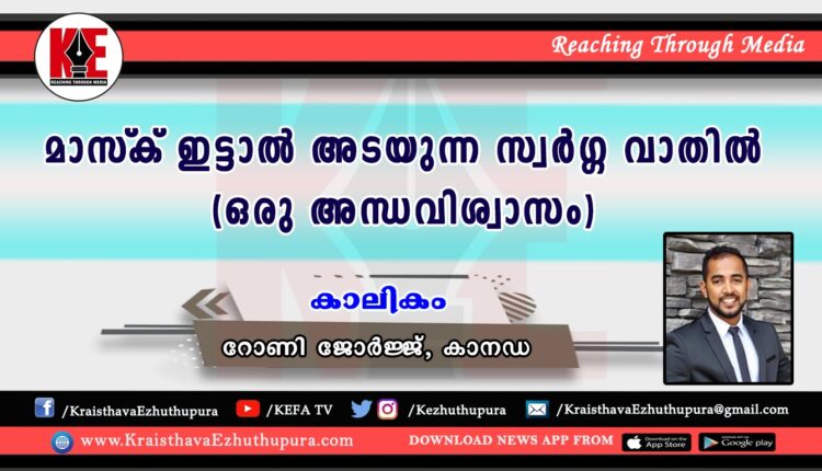 Malayalam Article കാലികം: മാസ്ക് ഇട്ടാൽ അടയുന്ന സ്വർഗ്ഗ വാതിൽ ( ഒരു അന്ധവിശ്വാസം) | റോണി ജോര്ജ്, കാനഡ Last updated Jul 10, 2020 1,222 കൊറോണയും മാസ്കും ദൈവ വിശ്വാസവും Share to WhatsApp - Advertisement - 1,222 Share WhatsAppFacebookTwitterGoogle+EmailPrintFacebook MessengerTelegram