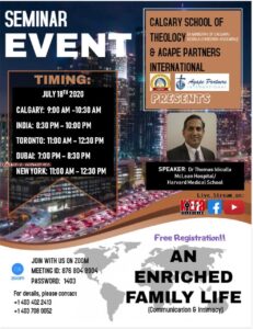 കാൽഗറി സ്കൂൾ ഓഫ് തീയോളജിയും അഗാപ്പെ പാർട്നർസും ചേർന്ന് നടത്തുന്ന സെമിനാർ ക്രൈസ്തവ എഴുത്തുപുരയുമായി ചേർന്ന് തത്സമയം സംപ്രേഷണം ചെയ്യപ്പെടുന്നു.
