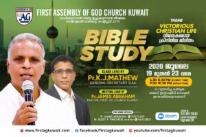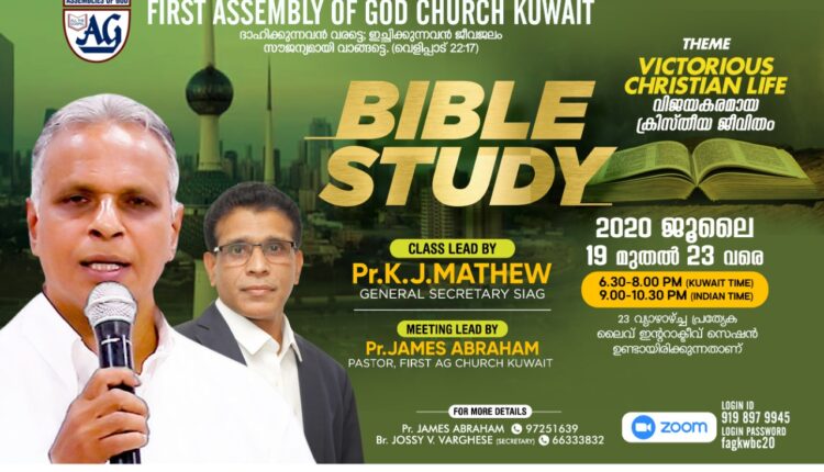 കുവൈറ്റ്: ഫസ്റ്റ് അസംബ്ളി ഓഫ് ഗോഡ് ചർച്ച് കുവൈറ്റ് ജൂലൈ 19 ഞാറാഴ്ച്ച മുതൽ ജൂലൈ 23 വ്യാഴാഴ്ച്ച വരെ നടത്തുന്ന 5 ദിവസത്തെ ഓൺലൈൻ ബൈബിൾ ക്ലാസ്സിൽ സുപ്രസിദ്ധ സുവിശേഷകനും കൺവെൻഷൻ പ്രഭാഷകനും, സൗത്ത് ഇന്ത്യ അസംബ്ലിസ് ഓഫ് ഗോഡ് ജനറൽ സെക്രട്ടറിയും, അസംബ്ലിസ് ഓഫ് ഗോഡ് ബെഥേൽ ബൈബിൾ കോളേജ് പുനലൂർ മുൻ പ്രിൻസിപ്പാളുമായ പാസ്റ്റർ കെ ജെ മാത്യു “വിജയകരമായ ക്രിസ്തീയ ജീവിതം” എന്ന വിഷയത്തിൽ ക്ളാസ്സുകൾ എടുക്കും.