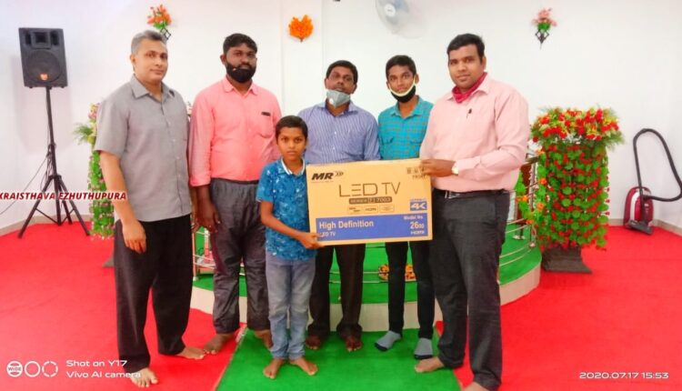 കോഴിക്കോട് : കൊറോണ വ്യാപനത്തിന്റെ കാരണത്താൽ സ്കൂളിൽ പോകാൻ പറ്റാത്ത സാഹചര്യത്തിൽ ഓൺലൈൻ ക്ലാസുകൾ നടക്കുന്നതിനാൽ നിർധനരായ കുട്ടികളെ സഹായിക്കുവാൻ വേണ്ടി ക്രൈസ്തവ എഴുത്തുപുര കേരള ചാപ്റ്ററും ശ്രദ്ധയും നടത്തുന്ന റ്റി.വി & ഐ.റ്റി ചലഞ്ചിന്റെ ഭാഗമായി ക്രൈസ്തവ എഴുത്തുപുര കോഴിക്കോട് യൂണിറ്റ് രണ്ടു വിദ്യാർത്ഥികൾക്ക് പഠന സഹായമായി ടെലിവിഷൻ നൽകി.