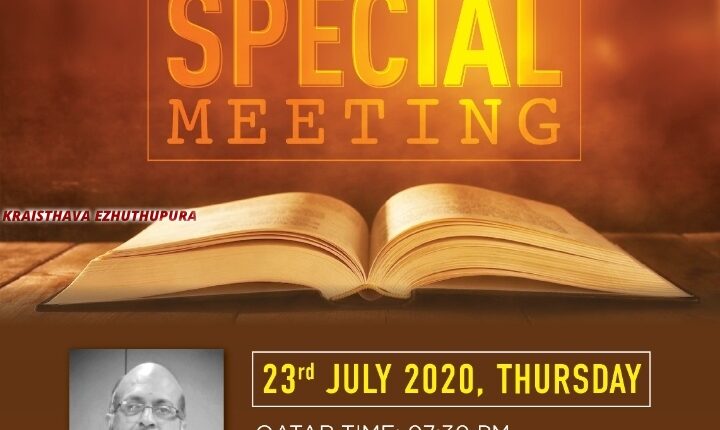 ദോഹ: ദോഹ അസബ്ലിസ് ഓഫ് ഗോഡ് സഭയുടെ ആഭിമുഖ്യത്തിൽ. 23.07.20 @ 7.30 pm (IST10pm) നടത്തപെടുന്ന മീറ്റിംഗിൽ സൂം പ്ലാറ്റഫോമിൽ കൂടി Dr കെ മുരളീധർ ശുശ്രുഷിക്കുന്നു. പ്രസ്തുത മീറ്റിംഗിൽ സഭ ശുശ്രുഷകൻ പാസ്റ്റർ സജി പി അധ്യക്ഷത വഹിക്കുകയും AG ഗായകസംഖം ഗാനശ്രുശൂഷ നിർവഹിക്കുകയും ചെയ്യും.