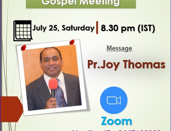 എടത്വാ: ഐപിസി ബെഥേൽ സഭയുടെ ആഭിമുഖ്യത്തിൽ ഓൺലൈൻ സുവിശേഷയോഗം നാളെ (ജൂലൈ 25 ) ശനിയാഴ്ച രാത്രി 8.30 മുതൽ സൂമിലൂടെ നടക്കും. പാസ്റ്റർ ജോയി തോമസ് ദൈവവചനത്തിൽ നിന്നും പ്രസംഗിക്കും.