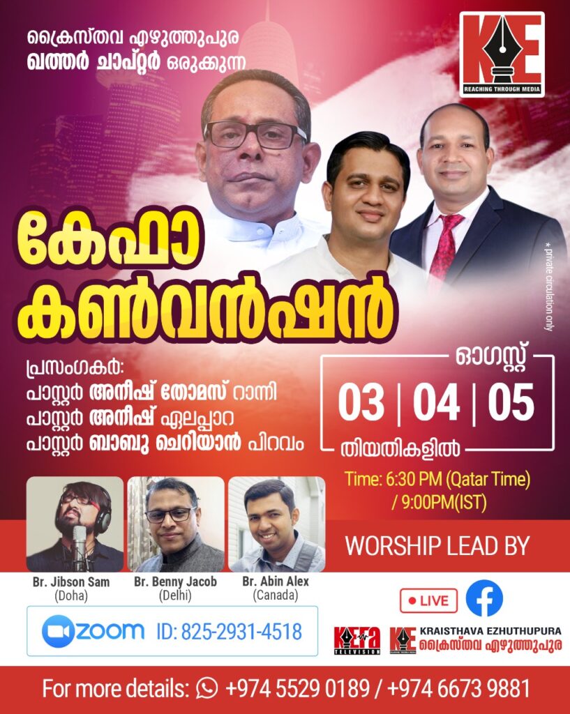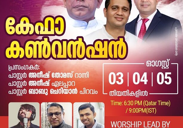 ക്രൈസ്തവ എഴുത്തുപുര ഖത്തർ ചാപ്റ്റർന്റെ നേതൃത്വത്തിൽ ‘കേഫാ കൺവൻഷൻ’ 2020 നാളെ മുതൽ.