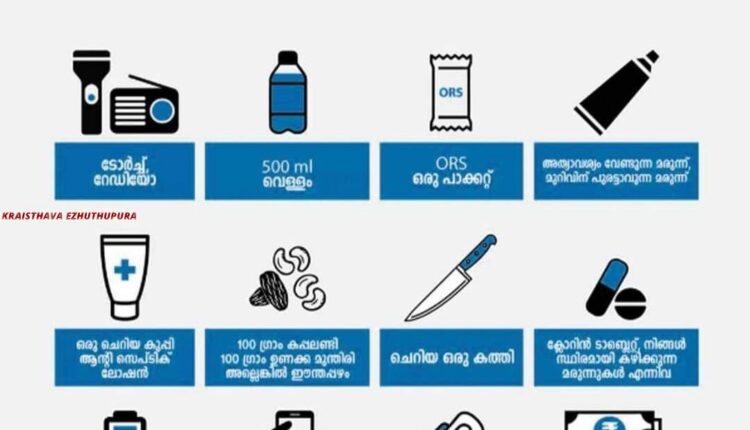 പത്തനംതിട്ട : വരും ദിവസങ്ങളിൽ കേരളത്തിൽ ശകത്മായ മഴയും കാറ്റും ഉണ്ടാകുമെന്നു കാലാവസ്ഥ നിരീക്ഷണ വകുപ്പിൽനിന്നുംസർക്കാർതലത്തിൽനിന്നുംഅറിയിപ്പുകൾ ലഭിക്കുന്ന ഈ അവസരത്തിൽ ഈ അവസരത്തിൽ എങ്ങനെപ്രതിരോധിക്കുവാൻ സാധിക്കും എന്നതിനെ വ്യകതമാക്കുന്നതിനാണ് ഈ കുറിപ്പ്. അടിയന്തരസാഹചര്യങ്ങളിൽ സർക്കാർഏജൻസികൾ മുഖേന സഹായങ്ങൾ ലഭ്യമാക്കുന്നതിന് ചില സാഹചര്യങ്ങളിൽ താമസമോ തടസ്സങ്ങളോ നേരിട്ടെന്നിരിക്കാം. എന്നാൽ അത്തരമൊരു സാഹചര്യത്തിൽ എങ്ങനെ അതിനെ മറികടക്കുവാനും പ്രതിരോധിക്കുവാനുംഎന്ത് ചെയ്യണംഎന്നുള്ളതിനെ കുറിച്ചാണ് പറയുന്നത്. അത്യാവശ്യമായി ഒരു അടിയന്തര കിറ്റ് കയ്യിൽ കരുതുകഎന്നുള്ളതാണ് പ്രാഥമികകമായി നാംചെയ്യേണ്ടത്.