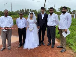 കാസർഗോഡ്: പെന്തെക്കോസ്ത്ക്കാർക്ക് വിവാഹത്തിന് സ്ഥലം ഒരു പ്രശ്നമല്ല എന്ന് തെളിയിക്കുന്ന ഒരു വിവാഹമാണ് ഇന്നലെ കാസറഗോഡ് നടന്നത്. കോവിഡ് നിയന്ത്രണത്തിൽ കേരളത്തിലെ വധുഗ്രഹത്തിൽ എത്താനാകാതെ കുടുങ്ങിയ വരന് അതിർത്തിയോട് ചേർന്ന് തലപ്പാടിയിലെ പെട്രോൾ പമ്പിനോടുത്തുള്ള പാതയോരം വിവാഹ വേദിയായി.