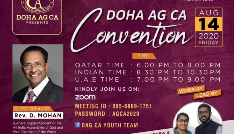 ദോഹ: അസംബ്ലീസ് ഓഫ് ഗോഡിന്റെ ഖത്തറിലെ പ്രഥമ സഭയായ ദോഹ ഏജി യുടെ യുവജനവിഭാഗമായ ക്രൈസ്റ്റ് അംബാസ്സഡേഴ്സിന്റെ നേതൃത്വത്തിലുള്ള ഏകദിന കൺവെൻഷൻ ഓഗസ്റ്റ് 14 വെള്ളിയാഴ്ച (ഇന്ന്) വൈകിട്ട് ഖത്തർ സമയം ആറിനു നടക്കും. ഓൾ ഇന്ത്യ അസംബ്ലീസ് ഓഫ് ഗോഡിന്റെ ജനറൽ സുപ്രണ്ടന്റായ ഡി. മോഹൻ മുഖ്യസന്ദേശം നൽകും. ഇവാ. ഫെബിൻ മാത്യു & ഗിഫ്റ്റി ഫെബിൻ എന്നിവർ ഗാനശുശ്രൂഷയ്ക്കു നേതൃത്വം നൽകും.