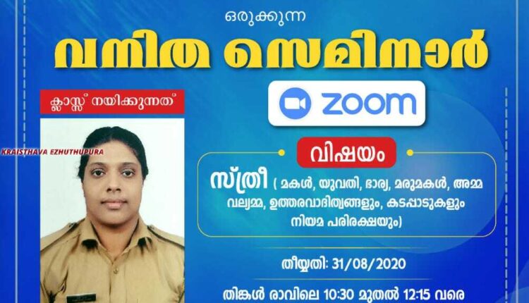 സ്ത്രീ- ഉത്തരവാദിത്വങ്ങളും കടപ്പാടുകളും,നിയമപരിരക്ഷയും(മകൾ, യുവതി,ഭാര്യ, മരുമകൾ,അമ്മ, വല്യമ്മ എന്ന നിലയിൽ )എന്ന വിഷയത്തെ ആസ്പദമാക്കി 31/08/2020 രാവിലെ 10:30 മുതൽ 12:30വരെ നടത്തപ്പെടുന്നു. ഷീബ സജി (Senior Civil Police Officer, Janamythri Vibhagam, Nilambur )ക്ലാസുകൾ നയിക്കും.