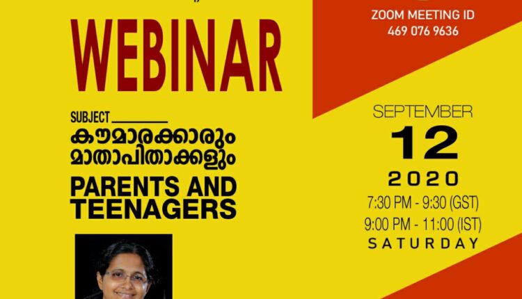 ഷാർജ : ശാരോൻ ഫെല്ലോഷിപ്പ് ഷാർജാ സെന്റർ വനിതാ സമാജത്തിന്റെ ആഭിമുഖ്യത്തിൽ “കൗമാരക്കാരും മാതാപിതാക്കളും”* എന്ന വിഷയത്തെ ആസ്പദമാക്കി സെപ്റ്റംബർ12 ശനിയാഴ്ച വൈകിട്ട് 7:30നു (UAE ) 9:00 (India) ക്കു ഒരു വെബിനാർ നടത്തപ്പെടുന്നു. മണക്കാല ഫെയ്ത് തിയോളജിക്കൽ സെമിനാരി പ്രിൻസിപ്പാൾ ഡോ. ആനി ജോർജ് ക്ലാസുകൾ നയിക്കും.