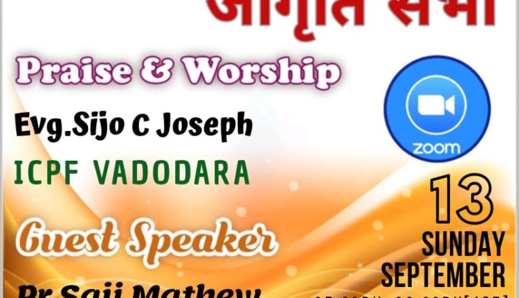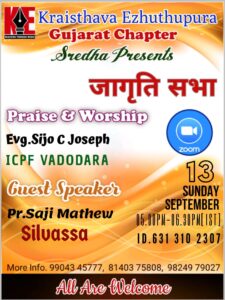 ക്രൈസ്തവ എഴുത്തുപുര ഗുജറാത്ത് ചാപ്റ്റർ”ജാഗ്രതി സഭ” ഹിന്ദി ആരാധന സെപ്റ്റംബർ 13 മുതൽ