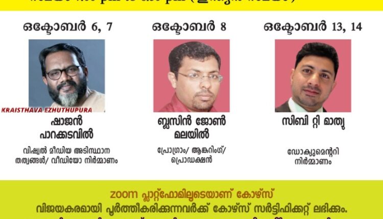 തിരുവല്ല : മീഡിയ വെബിനാറിന് ശേഷം വിഷ്വൽ മീഡിയയുമായി ബന്ധപ്പെട്ട പരിശീലന പദ്ധതിയുമായി ക്രൈസ്തവ ബോധി വീണ്ടുമെത്തുന്നു. വിഷ്വൽ മീഡിയ രംഗത്ത് പ്രവർത്തിക്കുന്നവർക്കായി ഒരുക്കുന്ന ഓൺലൈൻ പരിശീലന പരിപാടിയാണിത്. നവമാധ്യമങ്ങളിലുൾപ്പെടെ നിരവധി സങ്കേതങ്ങളിലൂടെ വിഷ്വൽ പ്രോഗ്രാമുകൾ ചെയ്യുന്നവരുടെ ആവിശ്യമാനുസരിച്ചാണ് “ക്രൈസ്തവ ബോധി ”