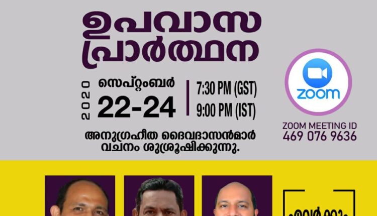 ഷാർജ : ശാരോൻ ഫെല്ലോഷിപ്പ് ചർച്ച് ഷാർജായുടെ ആഭിമുഖ്യത്തിൽ സെപ്റ്റംബർ 22 ചൊവ്വ മുതൽ 24 വ്യാഴം വരെ ത്രിദിന ഉപവാസ പ്രാർത്ഥന നടത്തപ്പെടുന്നു. എല്ലാ ദിവസവും വൈകിട്ട് 7:30 (UAE) 9:00PM (INDIA) നു സൂം പ്ലാറ്റ്ഫോമിൽ കൂടി മീറ്റിംഗുകൾ നടക്കുന്നത്.