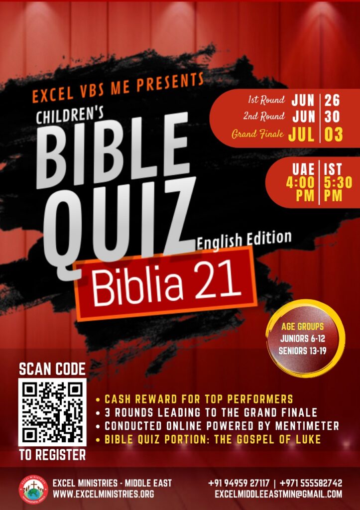 യു.എ.ഇ: പ്രമുഖ കുട്ടികളുടെ സംരക്ഷണ, സുവിശേഷ സംഘടനയായ എക്സൽ വിബിഎസ് മിഡിൽ ഈസ്റ്റ് സംഘടിപ്പിക്കുന്ന ബൈബിൾ ക്വിസ് മത്സരം 2021 ജൂൺ 26 ന് യു.എ.ഇ സമയം വൈകിട്ട് 4:00 മണിക്ക് ഓൺലൈനിൽ വഴി നടക്കും. എക്സൽ മിനിസ്ട്രീസ് ചെയർമാൻ റവ. തമ്പി മാത്യു ഉദ്ഘാടനം ചെയ്യും. 2021 ജൂലൈ 3 ന് ഗ്രാൻഡ് ഫൈനലിലേക്ക് നയിക്കുന്ന മൂന്ന് ഘട്ടങ്ങളിലായി ക്വിസ് നടത്തും. ലൂക്കോസിന്റെ സുവിശേഷത്തെ അടിസ്ഥാനമാക്കിയുള്ളതാണ് ക്വിസ് പ്രോഗ്രാം, ഇതു തിരുവെഴുത്തുകൾ ആത്മാർത്ഥമായി പഠിക്കാനും പഠിക്കാനും കുട്ടികളെ പ്രോത്സാഹിപ്പിക്കുന്നു. അവധിക്കാലത്ത് കുട്ടികളെ വചനം വായിക്കാൻ മത്സരം പ്രേരിപ്പിക്കുമെന്ന് എക്സൽ മിഡിൽ ഈസ്റ്റ് ഡയറക്ടർ റിബി കെന്നത്ത് പറഞ്ഞു. മാത്രമല്ല, യേശുവിന്റെ ജീവിതത്തിന്റെ വിശാലമായ ചിത്രം ഉൾക്കൊള്ളുന്ന ലൂക്കോസ് സുവിശേഷപഠനം ഒരേ സമയം കുട്ടികളുടെ ജീവിതത്തെ വെല്ലുവിളിക്കും.