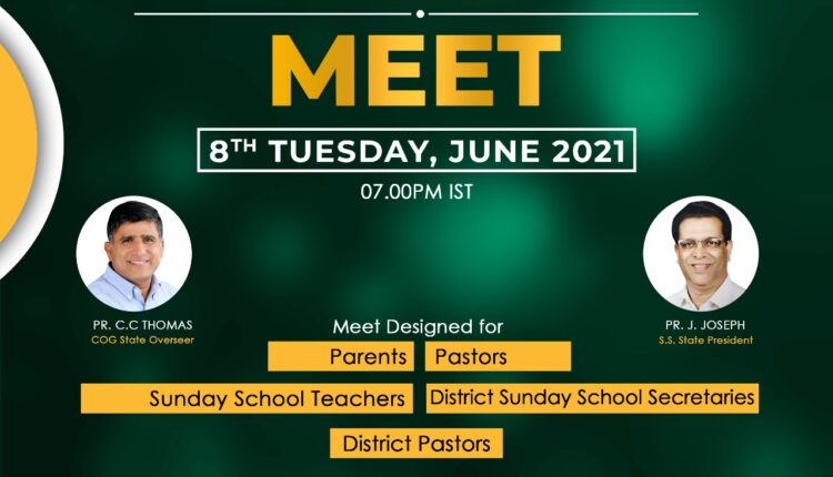 മുളക്കുഴ: ചര്ച്ച് ഓഫ് ഗോഡ് കേരളാ സ്റ്റേറ്റ് സണ്ടേസ്കൂള് ഡിപ്പാര്ട്ട്മെന്റിന്റെ ആഭിമഖ്യത്തിൽ സണ്ടേസ്കൂള് മീറ്റ് നാളെ (08/06/2021) വൈകിട്ട് 7ന് നടക്കുന്നു. സണ്ടേസ്കൂളിനെക്കുറിച്ചുള്ള സുപ്രധാനമായ അറിയിപ്പുകള് നല്കാനായി Zoom platform ല് വിളിച്ചു കൂട്ടുന്ന ഈ മീറ്റിംഗില് സണ്ണ്ടേസ്കൂള് സ്റ്റേറ്റ് പ്രസിഡന്റ് പാസ്റ്റര് ജെ. ജോസഫ് അദ്ധ്യക്ഷനായിരിക്കും. സ്റ്റേറ്റ് ഓവര്സിയര് പാസ്റ്റര് സി.സി. തോമസ് മുഖ്യാതഥിയായി പങ്കെടുക്കും. സംസ്ഥാന സണ്ടേസ്കൂൾ സെക്രട്ടറി സുവി. സാലു വർഗീസ് പ്രവർത്തന വിശദീകരണം നൽകും.