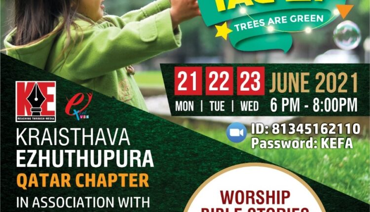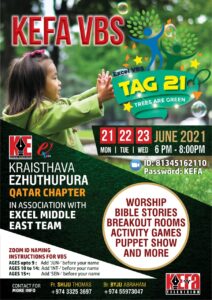 ദോഹ : ക്രൈസ്തവ എഴുത്തുപുര ഖത്തർ ചാപ്റ്ററിന്റെ നേതൃത്വത്തിൽ എക്സൽ മീഡിയ ഈസ്റ്റ് ടീമുമായി ചേർന്ന് കേഫാ വിബിഎസ് 2021 ജൂൺ 21 ,22 , 23 തീയതികളിൽ ഖത്തർ സമയം വൈകും നേരം ആറ് മണി മുതൽ എട്ടു മണി (IST 8.30 pm – 10.30pm) വരെ നടത്തപ്പെടും. സൂം പ്ലാറ്റഫോമിൽ കൂടി നടത്തപെടുന്ന വിബിഎസ് ന്റെ ഐഡി ‘81345162110’ ഉം പാസ്സ്വേർഡ് ‘KEFA’ എന്നും ആയിരിക്കും. കൂടുതൽ വിവരങ്ങൾക്ക് പാസ്റ്റർ ഷിജു തോമസ് +974 3325 3697 , ബ്രദർ ബൈജു എബ്രഹാം +974 5597 3047 തുടങ്ങിയവരെ ബന്ധപ്പെടാവുന്നതാണ്