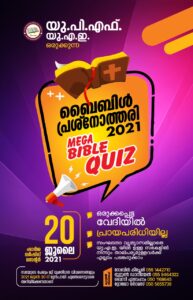 ദുബായ്: യു.പി.എഫ് യു.എ.ഇയുടെ ആഭിമുഖ്യത്തിൽ ‘Mega Bible Quiz’ ബൈബിൾ പ്രശ്നോത്തരി 2021 ജൂലൈ 20 ന് നടക്കും. യു.എ.ഇയിലെ സഭാ – സംഘടന വ്യത്യാസമില്ലാതെ താല്പര്യമുള്ള ഏവർക്കും പങ്കെടുക്കാം. മത്സരത്തിൽ പങ്കെടുക്കാൻ പ്രായപരിധിയില്ലാ.