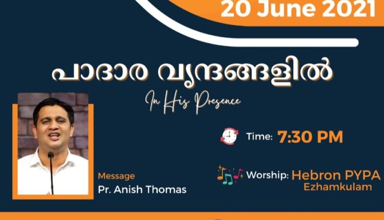 പത്തനാപുരം: പത്തനാപുരം സെന്റർ പിവൈപിഎയുടെ ആഭിമുഖ്യത്തിൽ സായാഹ്ന ആരാധന സൂം പ്ലാറ്റ്ഫോമിലൂടെ ഞാറാഴ്ച്ച(20-06-21) രാത്രി 7:30 മുതൽ 9 മണിവരെ നടത്തപ്പെടുന്നു. പാസ്റ്റർ അനീഷ് തോമസ് (റാന്നി) മുഖ്യ സന്ദേശം നൽകും.സംഗീത ശുശ്രൂഷക്ക് ഹെബ്രോൻ പിവൈപിഎ, ഏഴംകുളം നേതൃത്വം നൽകും.