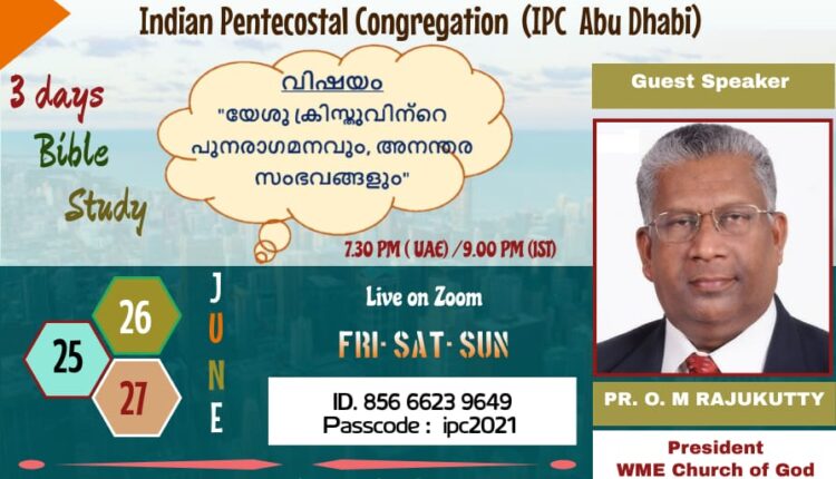 അബുദാബി: ഇന്ത്യ പെന്തെക്കോസ്ത് ദൈവസഭ (ഐ.പി.സി) അബുദാബി സഭയുടെ ആഭിമുഖ്യത്തിൽ മൂന്ന് ദിവസത്തെ ബൈബിൾ ക്ലാസ്സുകൾ ജൂൺ 25 മുതൽ 27 വരെ (വെള്ളി, ശനി, ഞായർ) ദിവസങ്ങളിൽ വൈകിട്ട് 7.30 മുതൽ 9.30 നടക്കും.