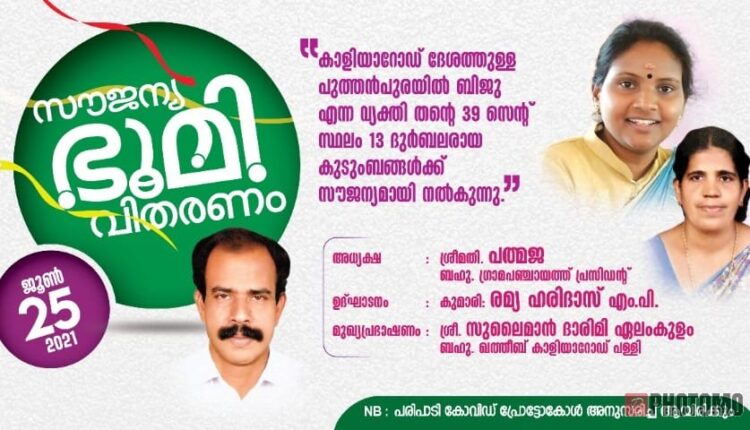 കാളിയാറോഡ്: കാളിയാറോഡ് പുത്തൻപുരയിൽ ബിജു ചെറിയാന്റെ 39 സെൻ്റ് സ്ഥലം ഭൂരഹിതരും ഭവനരഹിതരുമായ 13 കുടുംബങ്ങൾക്ക് സൗജന്യമായി 3 സെൻ്റ് വീതം ദാനം നല്കുന്നത്. ഇന്ന് ജൂൺ 25 ന് 2 മണിക്ക് കോവിഡ് പ്രോട്ടോക്കോൾ പ്രകാരം ആലത്തൂർ എം. പി. രമ്യ ഹരിദാസ് ഉദ്ഘാടനം ചെയ്യും. ഗ്രാമപഞ്ചായത്ത് പ്രസിഡണ്ട് പത്മജ അദ്ധ്യക്ഷത വഹിക്കും. കാളിയാറോഡ് കേന്ദ്ര ജുമാത്ത് ഖത്തിബ് സുലൈമാൻ ദാരിമി മുഖ്യപ്രഭാഷണം നടത്തും. വിവിധ മത രാഷ്ട്രിയ സാമൂഹിക മേഖലകളിലെ പ്രമുഖർ ചടങ്ങിൽ പങ്കെടുക്കും.
