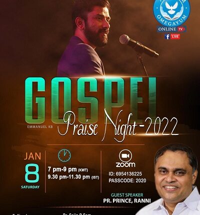 ഷാരോൺ ഫെലോഷിപ്പ് ചർച്ച് കുവൈറ്റ് സി.ഇ.എം ന്റെ നേതൃത്വത്തിൽ 08-01-2022 ശനിയാഴ്ച ഏകദിന മീറ്റിംഗ് നടക്കും സമയം 7 pm മുതൽ 9 pm വരെ സൂമിൽ കൂടി(IST 9:30pm മുതൽ 11:30pm )ബ്രദർ ഇമ്മാനുവേൽ കെ.ബി ആരാധനയ്ക്ക് നേതൃത്വം നൽകുന്നു പാസ്റ്റർ പ്രിൻസ് റാന്നി ദൈവവചനം ശ്രുശൂഷിക്കും.ആൽഫാ ഒമേഗ facebook ലൈവ് ഉണ്ടായിരിക്കുന്നതാണ്.