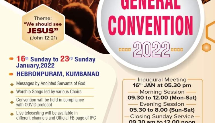 കുമ്പനാട്: ഇന്ത്യാ പെന്തെക്കോസ്ത് ദൈവസഭയുടെ 98-ാമത് ജനറല് കണ്വന്ഷന് ജനുവരി 16 മുതൽ 23 വരെ സഭാ ആസ്ഥാനമായ കുമ്പനാട് ഹെബ്രോന്പുരത്ത് നടക്കും.
