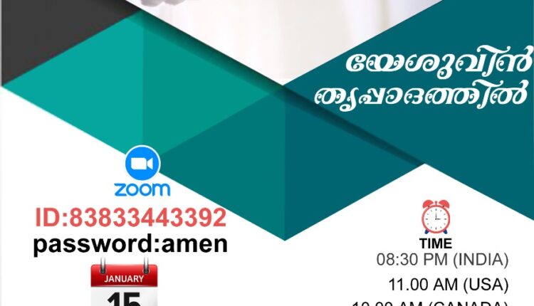 ശനിയാഴ്ച വൈകിട്ടു ഇന്ത്യൻ സമയം 8 :30 നു ഓൺലൈനിലൂടെ (ZOOM) നടക്കും. പാസ്റ്റർ കിഷോർ നമ്പീശൻ (കർമേൽ വർഷിപ് സെന്റർ, ഒറ്റപ്പാലം)മുഖ്യ സന്ദേശം നൽകും.