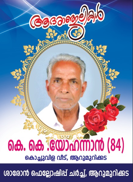 കൊല്ലം :ആറുമുറിക്കട കൊച്ചുവിള വീട്ടിൽ കെ.കെ.യോഹന്നാൻ സാറിൻ്റെ സംസ്കാര ശുശ്രൂഷ ഫെബ്രുവരി 2 ബുധനാഴ്ച രാവിലെ 8.00 മണിക്ക് ആറുമുറിക്കട ശാരോൻ ഫെല്ലോഷിപ്പ് ചർച്ചിൻ്റെ നേതൃത്വത്തിൽ ശുശ്രൂഷ ഭവനത്തിൽ ആരംഭിച്ച് 12 മണിക്ക് ശാരോൻ സെമിത്തേരിയിൽ. ഗവൺമെൻറ് പ്രോട്ടോകോൾ അനുസരിച്ചായിരിക്കും ശുശ്രൂഷകൾ.