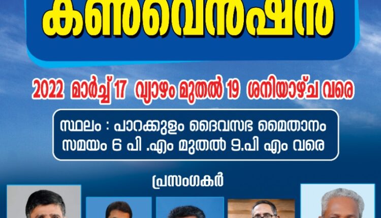 കോട്ടയം : ഇന്ത്യാ പൂർണ്ണ സുവിശേഷ ദൈവസഭ. കോട്ടയം വെസ്റ്റ് സെന്റർ കൺവൻഷൻ പാറക്കുളം ദൈവസഭാ മൈതാനത്തിൽ മാർച്ച് 17, 18, 19 തീയതികളിൽ വൈകിട്ട് 6 മണി മുതൽ 9 മണി വരെ നടക്കും. സെന്റർ പാസ്റ്റർ റ്റി.പി. മാത്യു ഉത്ഘാടനം നിർവ്വഹിക്കും. പാസ്റ്റർമാരായ അജി ആന്റണി, റെജി ശാസ്താകോട്ട , ബാബു ചെറിയാൻ പിറവം എന്നിവർ വചനം ശുശ്രൂഷിക്കുന്നു. സെന്ററിലെ പാസ്റ്റർമാർ അദ്ധ്യക്ഷത വഹിക്കും. സെന്റർ ക്വയർ ഗാനങ്ങൾ ആലപിക്കും.