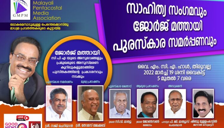 ഗ്ലോബൽ മലയാളി പെന്തക്കൊസ്തു മീഡിയ അസോസിയേഷന്റെ ആഭിമുഖ്യത്തിൽ സാഹിത്യ സംഗമവും ജോർജ് മത്തായി പുരസ്കാര സമർപ്പണവും ഇന്ന് (മാർച്ച് 19) വൈകിട്ട് 5 മണിക്ക് തിരുവല്ല വൈ എം സി എ ഹാളിൽ നടക്കും.